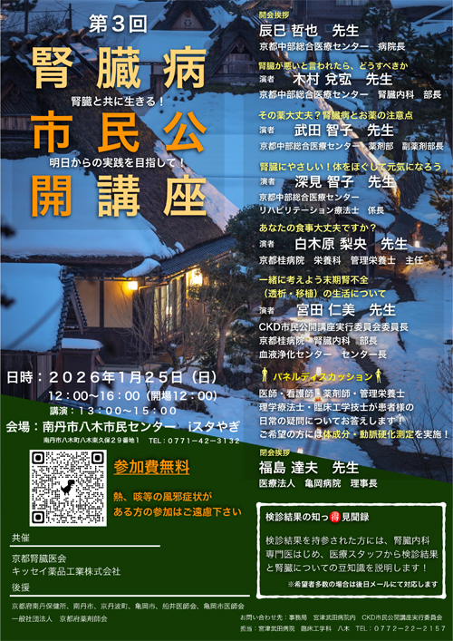 また、亀岡市医師会と合同で毎年4回、講師を招聘して学術講演会を開催しています。秋の防災の日前後に開催する講演会は災害医療をテーマとした学術集会を行っています。今年の1月には能登半島の大きな地震がありました。災害はいつ起こるかわからず、普段から心の備えをしておけるよう配慮しています。